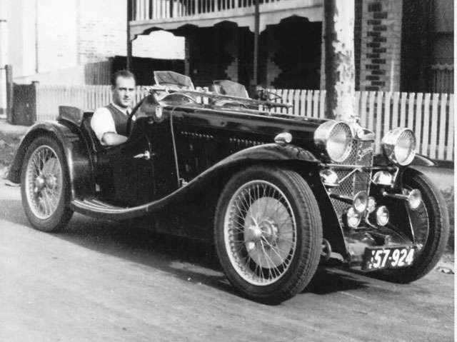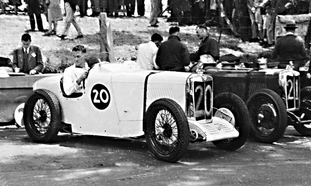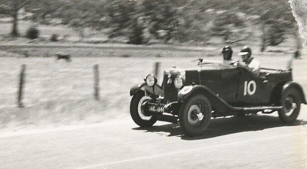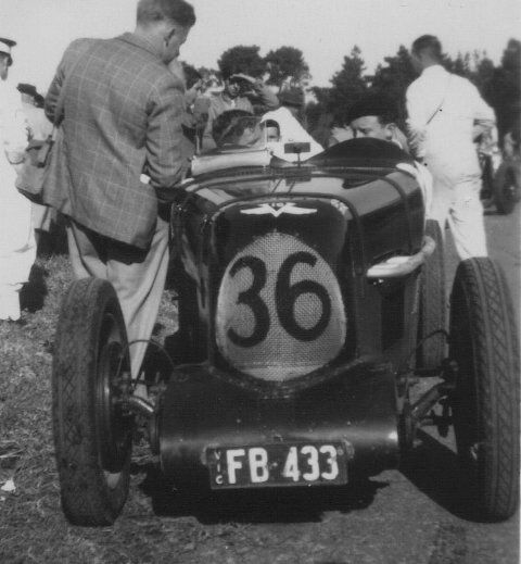 Here is George Notley at the wheel of J2 (J4212). It is hard to believe this is the Colin Keefer car in the Phillip Island line up. Underneath all that bling lies the Aspinall body, to which doors and mudguards have been added, not to mention trumpet horns, spotlights and special badging. The huge brake drums are actually fake wheel discs; a ‘claytons’ Magnette? George struggled up Rob Roy in 1947 for a time of 53 seconds. Soon after, the original engine was replaced by a Ford unit. Later restored by Walter and Matthew Magilton and now owned by Ron Killcullen in W.A. Magilton collection.