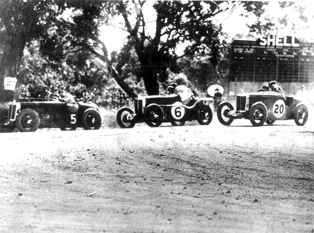 You are now standing on the outside of “Young and Jackson’s” corner on the old Phillip Island circuit and bracing yourself for any flying stones. It is New Years Day 1934 and three members of the Lanes Motors MG team are screaming past in this 100 mile race. Note how the riding mechanics are throwing their weight behind the drivers as the cars bounce across the rutted track. These Aspinall bodies were fitted with a handle behind the driver for this purpose. Les Jennings in L0546 leads Ces Warren in J3766 and Les Murphy in J4112.