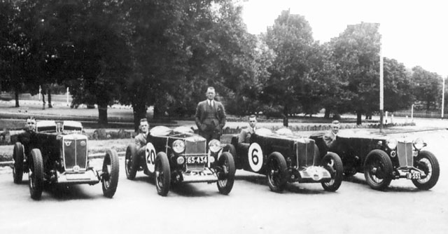 Here is the Lanes Motors MG team before they set off for Phillip Island to compete in the 1934 New Years Day 100 Mile race. Standing behind is Robert Lane whose MG agency covered Victoria, Tasmania and the Riverina. These cars were imported without bodies and then had rugged steel framed bodies fitted by Charlie Aspinall of Armadale. From left to right we have: a. Norm Putt in F1317 reg 1.187. Finished 6th. b. Les Murphy in J4112 reg 65.434. Finished 7th. c. Ces Warren in (J3) J3766 reg 11.527. Finished outside the time limit but not before posting a 750cc lap record. d. Les Jennings in L0546 reg 8.551. Finished 5th. Photo and research from Tim Jackson.