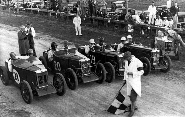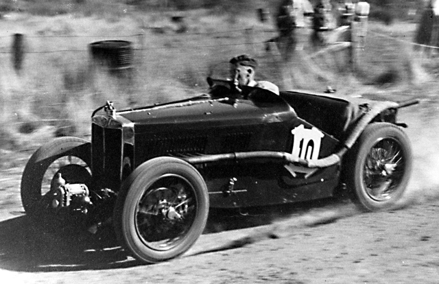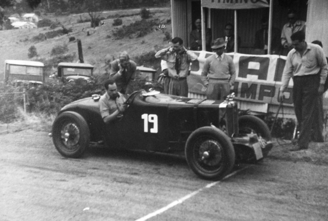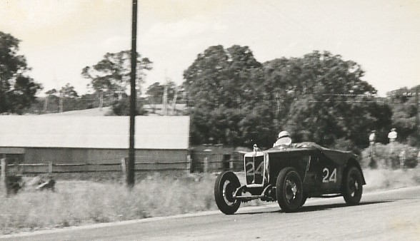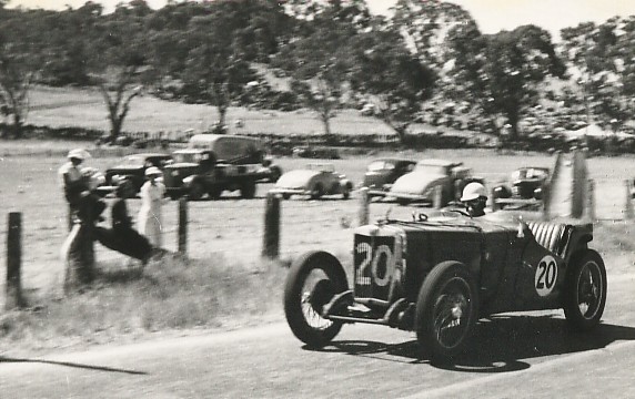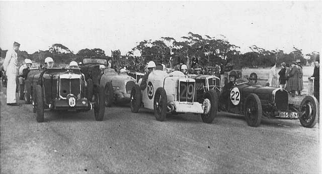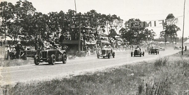…And the limit men are away! The start of the Australian Grand Prix at Lobethal in January 1939. This view from in front of the grandstand shows Russell Bowes of S.A. in the N type Magnette (#24) getting the jump on Dr Robert Manser of Melbourne in the NA #0281 (Walter Magilton’s car). Close behind is the Morgan Special of Jack Boughton (#25) and the TB of Raymond Curlewis (#20). Raymond was planning to drive an N type in this race, but he rolled over in the previous race at that event (The 75 mile South Australian Grand Prix). Raymond who was born in Warwick, Qld, enlisted in the RAAF and was a Sgt with 75 Squadron when he was killed in 1941. What became of the TB?