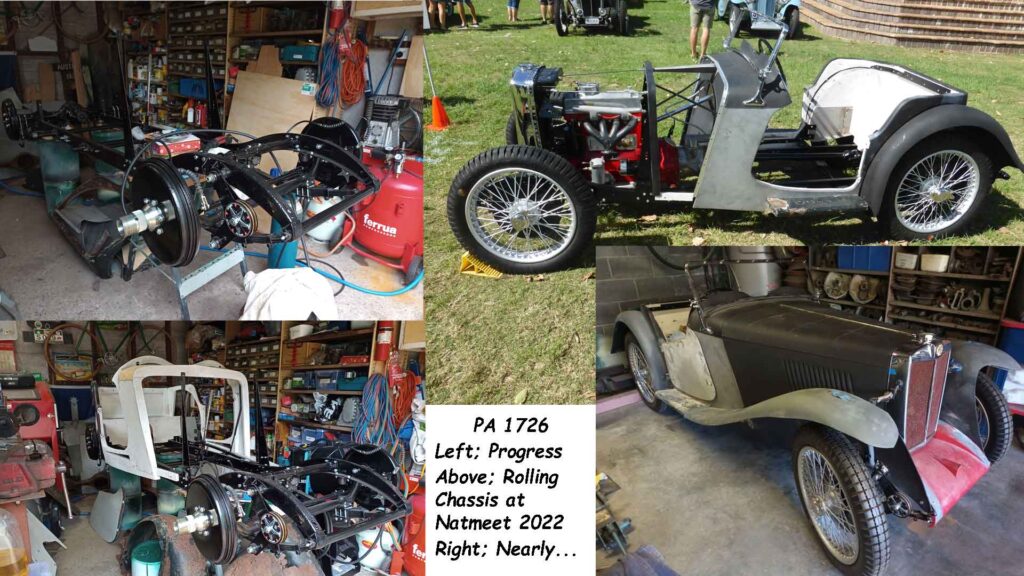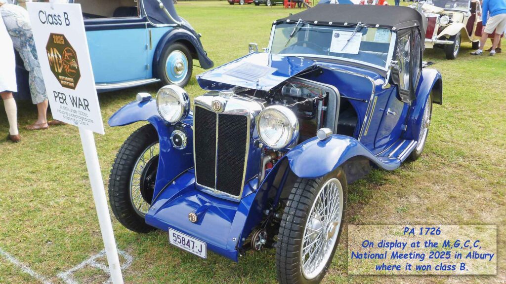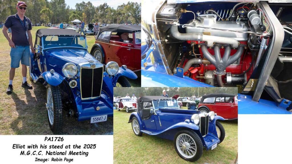 Elliot displayed the unfinished car in the  Rolling Chassis class at the M.G.C.C. National Meeting at Lake Macquarie in 2022.  The completed car entered the National Meeting in Albury 2025 and won its class in the concours.